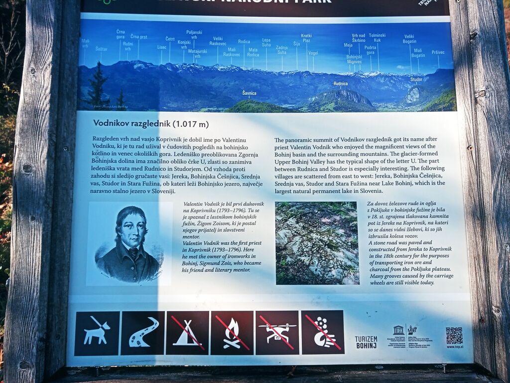 Iz Jereke smo šli po kolovozu, ki je pred 200 leti služil za dovoz železove rude iz Pokljuke v Bohinj. Na nekaterih mestih so še vidni žlebovi v kamnu. Je pa bila pot precej mokra, ker gre večinoma ob manjšem potočku. Pot ni strma in nas po uri hoje pripelje pod vrh. Zadnjih nekaj metrov je precej strmih, a smo na koncu nagrajeni s čudovitimi razgledi proti Bohinjskem jezeru in vsem goram, ki ga obdajajo. Ni čudno, da je Vodnikov razglednik tako rad obiskoval sam Valentin Vodnik, ki je v vasi Koprivnik nekaj časa opravljal duhovniško službo. Obiskali smo tudi rojstno hišo prvopristopnika na Triglav, Luko Korošca.