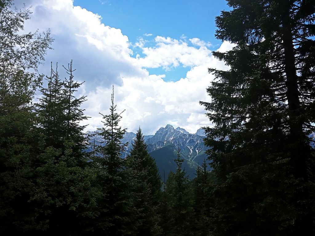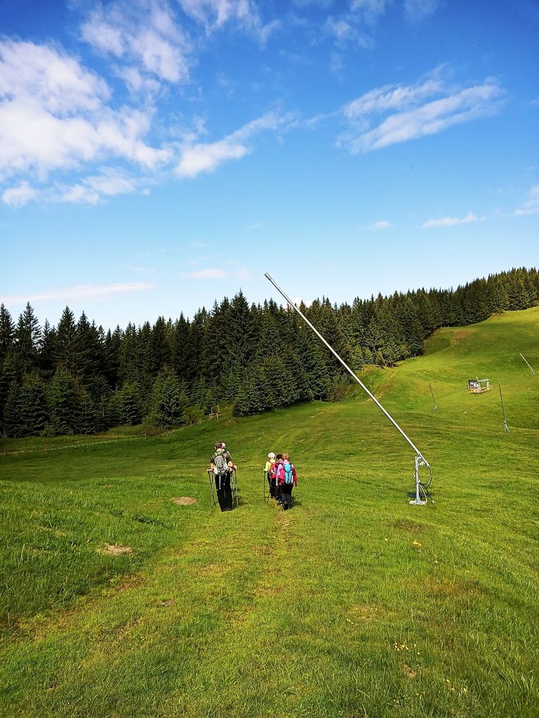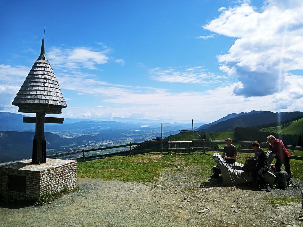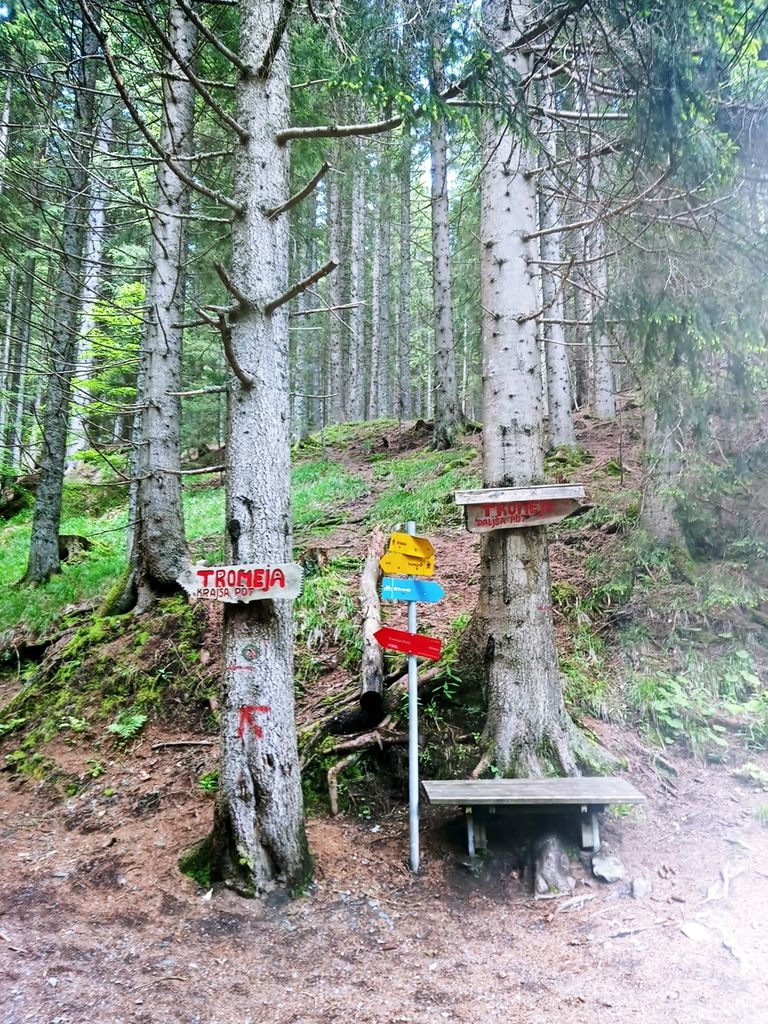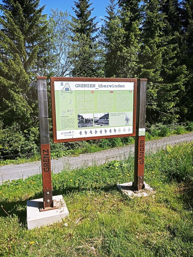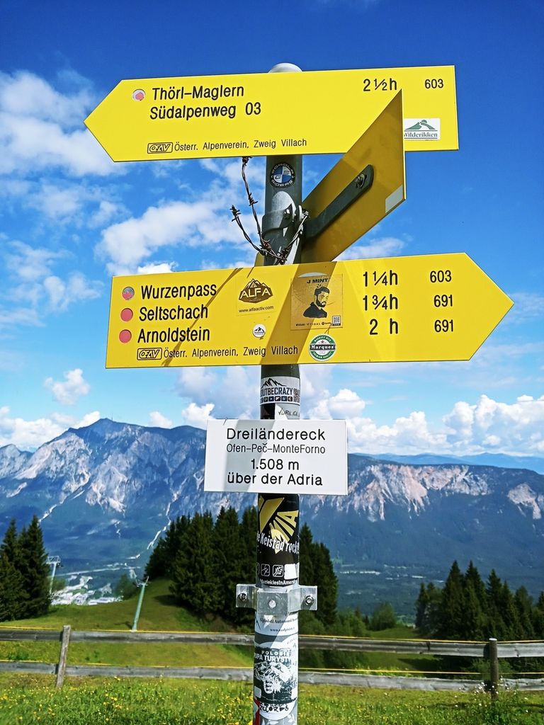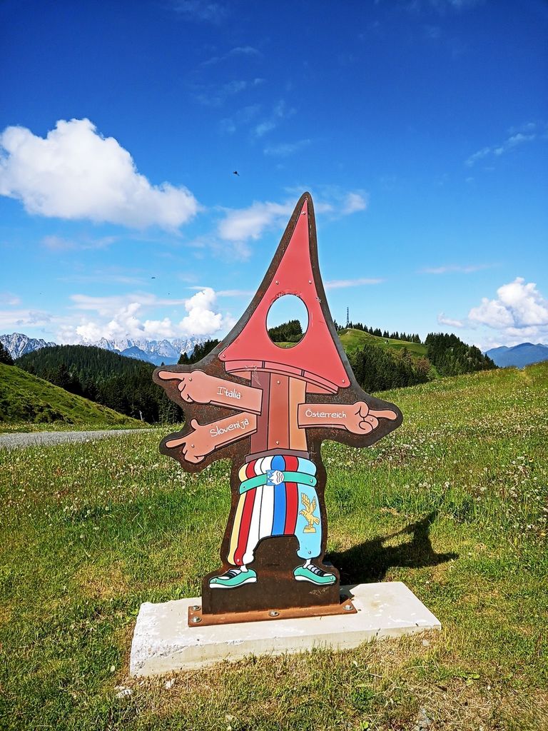 Po dolgem času res lepo vreme. Hitro smo se ogreli v začetni strmini. Hodi se po gozdu, vse dokler se ne pride do prostranih zelenih travnikov, ki se pozimi spremenijo v smučišča. Na desni se nam pokaže raztegnjen Dobrač. Hodimo ob meji. Ko pridemo do zgornje postaje žičnice, se pod nami odpre Ziljska dolina. Spustimo se do koče Dreiländereck Hütte, kjer pomalicamo in spijemo kavo. Vseskozi nas spremljajo informacijske table, na katerih so predstavljene krajevne značilnosti in zanimivosti. Tako je bilo zapisano na tabli ob koči, da je bilo na teh poteh »švercanje« precej donosna obrt. Največ se je preneslo najlonk, moke, sladkorja, vina in živine. Na vrhu Tromeje smo se postavili ob tromejnik, sprobali lesene ležalnike. Čas ob lepem vremenu je bil za uživanje. Razgledali smo se po hribih vseh treh držav. Spuščali smo se po naši strani v Rateče.