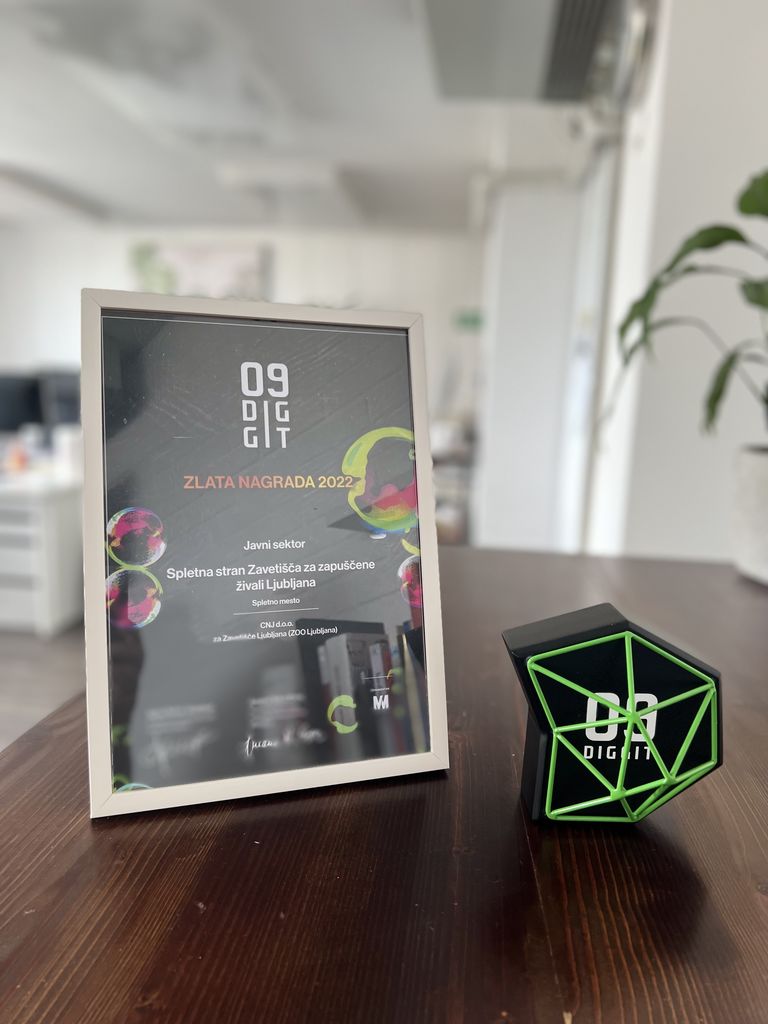 Na Konferenci o digitalnih trendih je nova spletna stran Zavetišča Ljubljana v izvedbi agencije CNJ z dobro UX zasnovo, modernim in všečnim designom ter z uporabo zadnjih tehnologij in z nekaj inovativnimi funkcijami pometla s konkurenco in prejela eno izmed 11. Zlatih nagrad Diggit, in sicer v kategoriji Javni sektor za najboljše spletno mesto. Stran je posebna predvsem zaradi posebnih funkcij kot je plavajoči vtičnik za hitro in enostavno doniranje, ponuja možnost organizacije lastne donacijske kampanje za zbiranje sredstev, uporabnik lahko živali za posvojitev pregleduje v obliki “Tinderja” za živali in posvojitelje ali si pomaga s funkcijo “Pusti se presenetiti”.