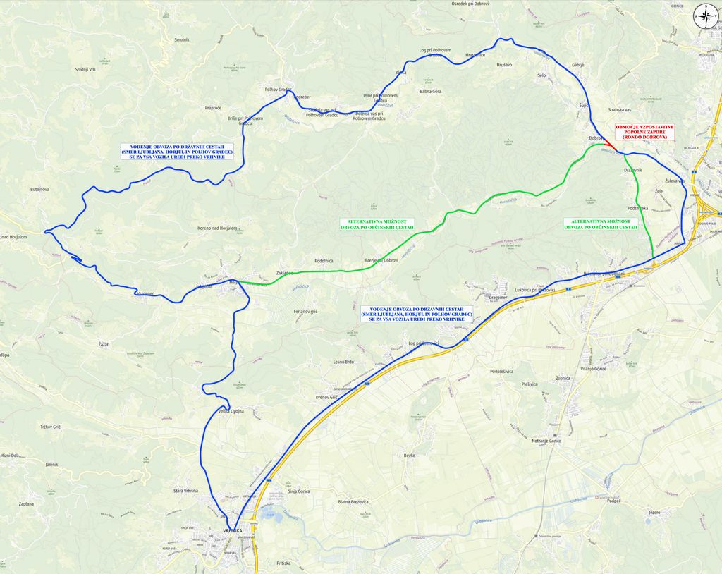 Vodenje obvoza bo za vsa vozila v obeh smereh urejeno preko Vrhnike in bo potekalo na relaciji Dobrova – Šujica – Log pri Polhovem Gradcu – Polhov Gradec – Šentjošt – Horjul – Vrhnika – Drenov Grič – Lukovica pri Brezovici – Brezovica pri Ljubljani.