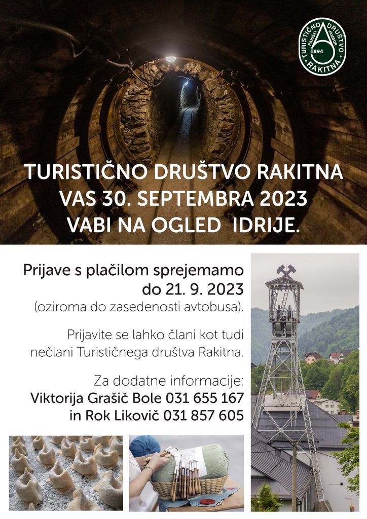Turistično društvo Rakitna vas 30. septembra 2023 vabi na ogled  Idrije. V najstarejšem slovenskem rudarskem mestu so več kot 500 let doneli udarci kladiv in rudarski stroji. Drugi največji rudnik živega srebra na svetu je Idriji prinesel razcvet na področju tehnike, izobraževanja in kulture.