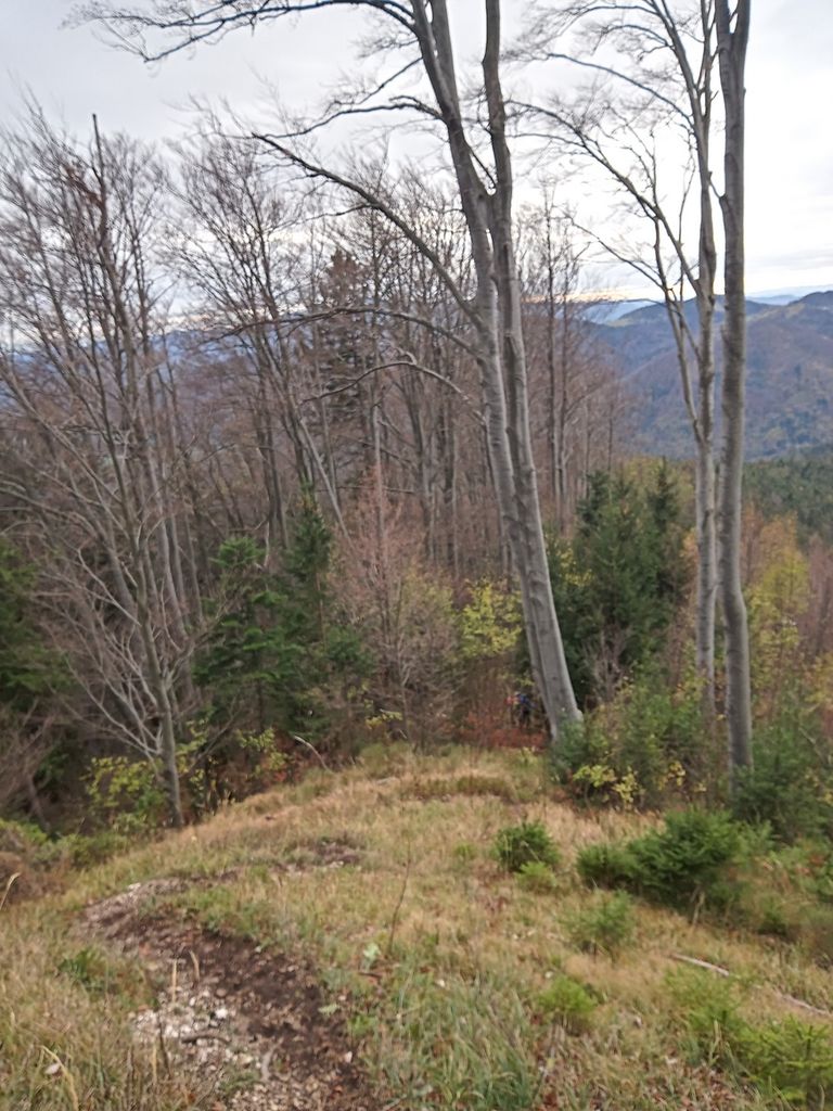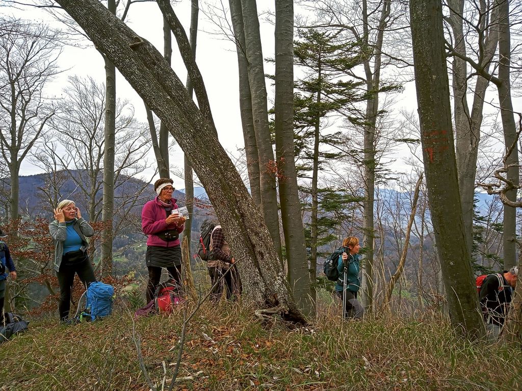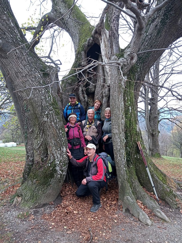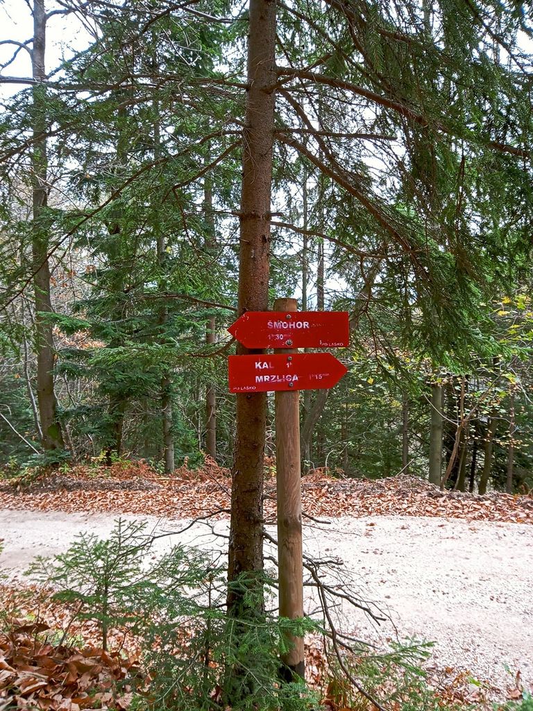 Kombi nas je odložil pred Planinsko rudarskim domom na Kalu nad Hrastnikom, od koder do vrha Mrzlice ni prav daleč, le kratek čas kar huda strmina. Prisopihali smo do vrha, se na ploščadi slikali, razgledali naokoli in se spustili do doma pod njo. Lepo vzdrževana koča, dobro obiskana. Posedli smo se, popili prvi čaj, pojedli prvi sendvič iz nahrbtnika. Pripravljeni za nadaljevanje, do kar precej oddaljenega Gozdnika. Vso višino, ki smo jo pridobili do Mrzlice smo morali izgubiti, pa še dodatnih dvesto metrov. Pot na tem delu je res zelo strma, v tem letnem času polna listja, tako da previdnost ni bila odveč. Že sam ime vrha pove, da se bomo gibali predvsem po gozdu. Tudi ta del je bil precej strm, precej koreninast, je pa na vrhu postavljen bivak. Ker nekih razgledov ni bilo, se nismo prav dolgo na vrhu zadržali. Potrebno se je bilo spustiti še do končnega cilja, do Planinskega doma na Šmohorju. Pot pelje mimo starodavnih mogočnih lip ob cerkvici sv Mohorja. V eno smo se lahko celo zavili. Ko bi imeli več časa, bi lahko prisluhnili zgodbam zgodovine, mi pa smo le naredili sliko.