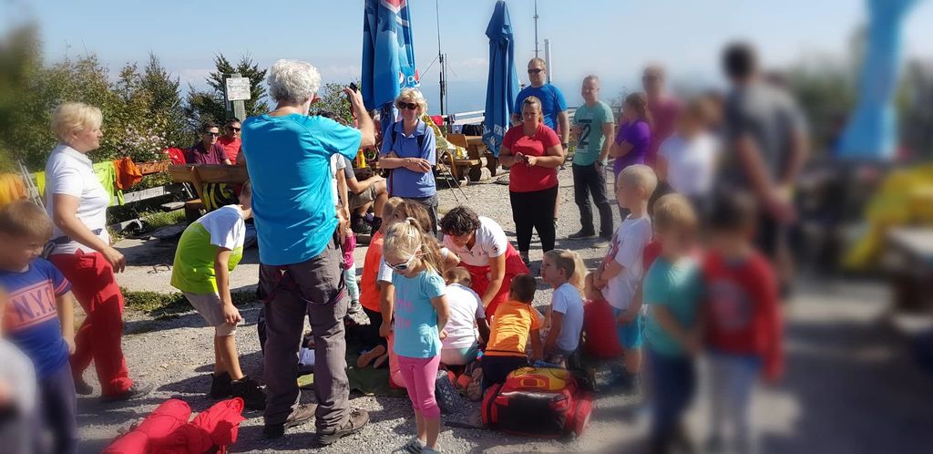 Društvo je namreč organiziralo že 39. družinski pohod na Krim in v skorajda poletnem vremenu smo v spremstvu njihovega vodnika Marijana najprej izvedle vzpon na »streho barja«, nato pa smo v družbi družin in naključnih pohodnikov izvedle delavnico osnov prve pomoči. Odrasli so se z velikim zanimanjem lotili rokovanja z defibrilatorjem, mlajši pa so do popolnosti oskrbeli našega plišastega Rexa, na koncu pa tudi drug drugega. Otroci so se nato pod okriljem brezoviških vrtcev lahko udeležili še iger brez meja s simpatičnimi nagradami.