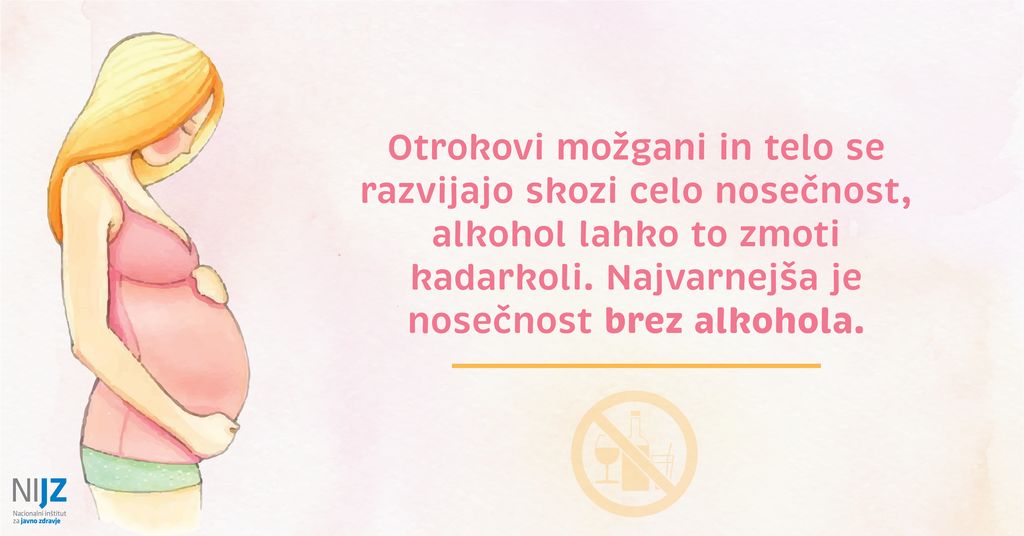 Alkohol lahko vpliva na rast in razvoj otroka skozi celo nosečnost. Enako škodljive so vse vrste alkoholnih pijač, ne glede ali je to pivo, vino, žgane ali mešane alkoholne pijače. Kljub temu naj bi po ocenah dobra četrtina žensk v Sloveniji v času nosečnosti pila alkoholne pijače; pogosto prav v začetnih mesecih, ko bodisi še ne vedo, da so noseče, ali pa so mnenja, da v začetnih fazah nosečnosti pitje alkohola otroku ne more škoditi.