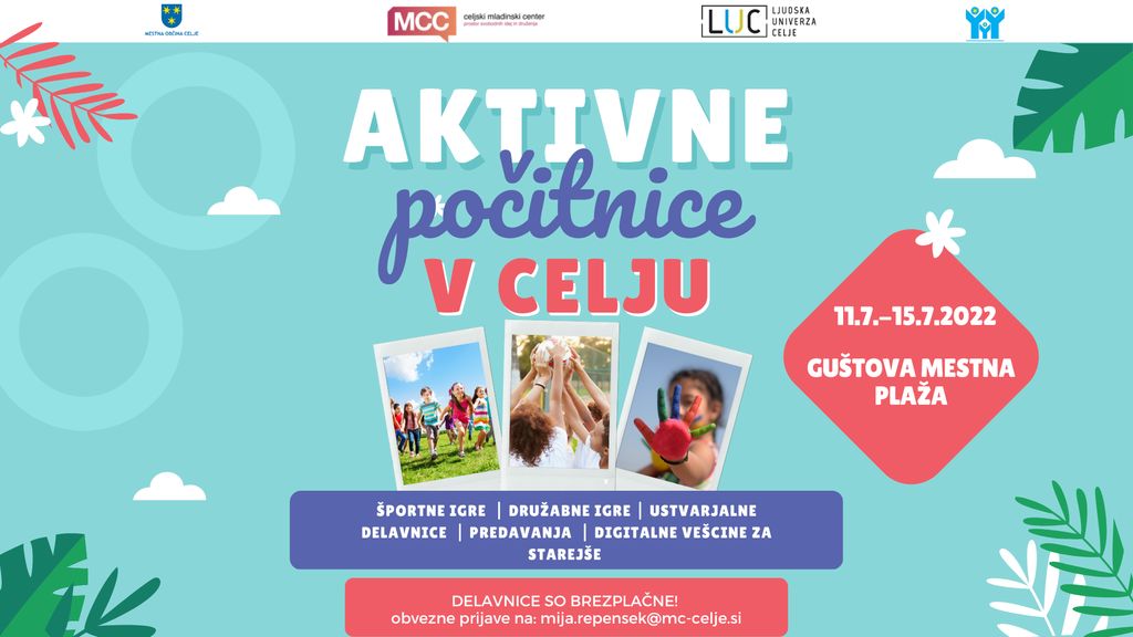 Kot vsako poletje bomo tudi letos počitnice v Celju preživeli kreativno in zabavno. Celjski mladinski center bo letos ponovno organiziral v sodelovanju z Metno občino Celje, Javnim zavodom SOCIO in Ljudsko univerzo Celje AKTIVNE POČITNICE v mestnih četrtih in krajevnih skupnostih znotraj Celja. Vse od 4. julija 2022 do 19. avgusta 2022, se bodo v mestnih četrtih in krajevnih skupnostih odvijale športne in družabne igre, ustvarjalne delavnice ter predavanja in delavnice, ki jih bodo mladinski delavci in animatorji izvedli v sodelovanju z Javnim zavodom SOCIO in Ljudsko univerzo Celje.