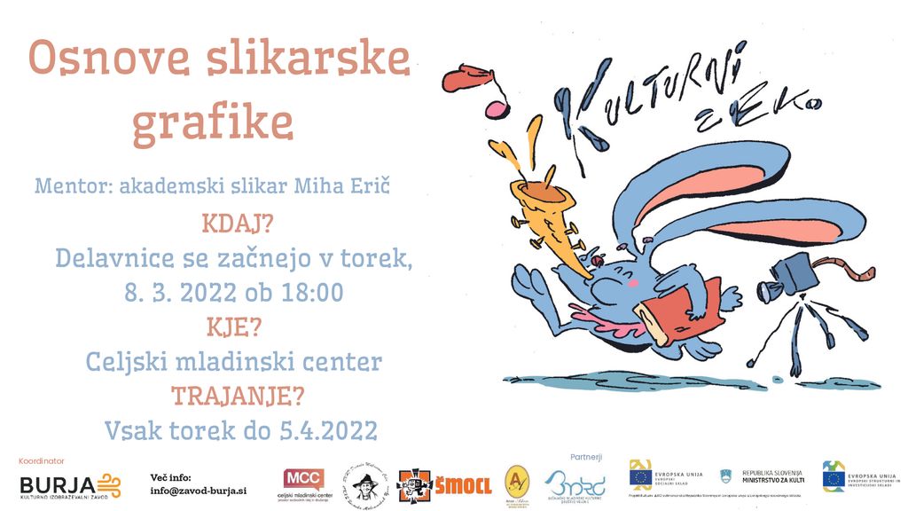 Celjski mladinski center vas v sodelovanju z Zavodom Burja vabi na delavnice Osnov slikarske grafike, ki jih bo v okviru projekta Kulturni zEKO v mesecu marcu izvajal akademski slikar Miha Erič.