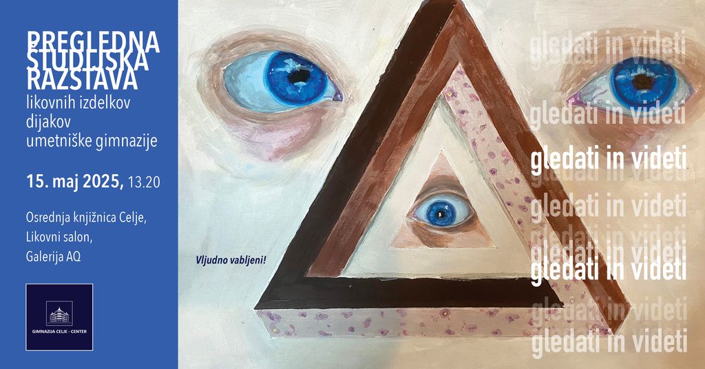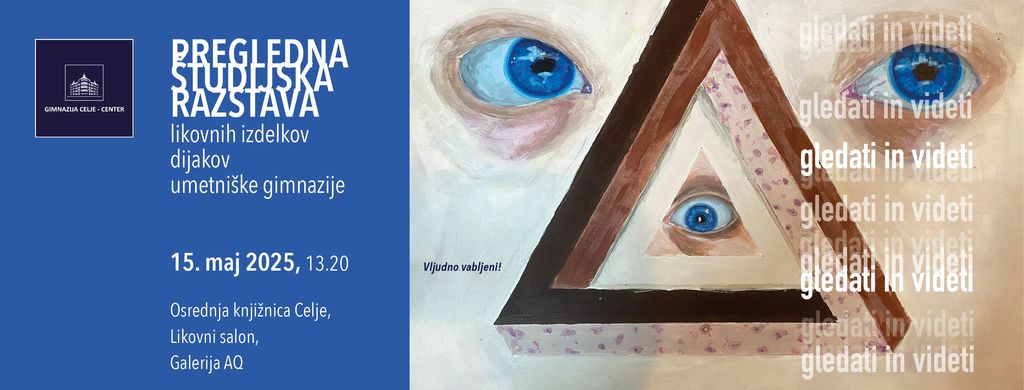 Vabljeni na odprtje 21. pregledne študijske razstave likovnih izdelkov dijakov umetniške gimnazije – likovna smer z naslovom Gledati in videti, ki bo v četrtek, 15. maja 2025, ob 13.20 pred Osrednjo knjižnico Celje.