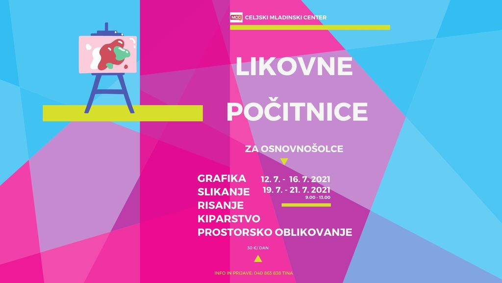 Vabim vas, da se udeležite strokovno vodenih likovnih delavnic v ustvarjalnem okolju MCC prostorov. Delavnice bodo trajale od 9. do 13. ure, z vmesnim odmorom za malico (iz nahrbtnika).