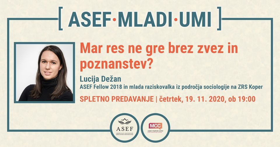 ASEF v sodelovanju s Celjskim mladinskim centrom predstavlja spletno poljudnoznanstveno predavanje Lucije Dežan, ASEF Fellow 2018 in mlade raziskovalke iz področja sociologije na ZRS Koper. Na predavanju bodo predstavljeni načini, kako se mladi lotevajo iskanja zaposlitve, ter kakšna je vloga zvez in poznanstev pri tem.