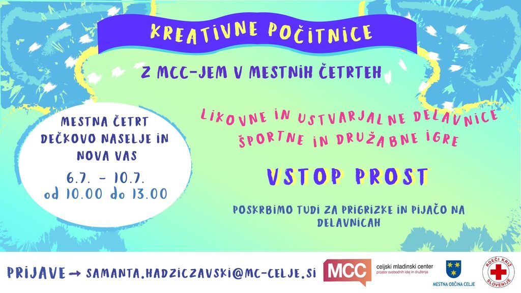 Mcc Celjski Mladinski Center bo v sodelovanju z Mestno četrt Dečkovo Naselje in Nova vas ter Mestno obcino Celje, poskrbel, da poletne počitnice preživite kreativno in v športnem duhu!