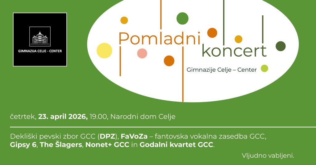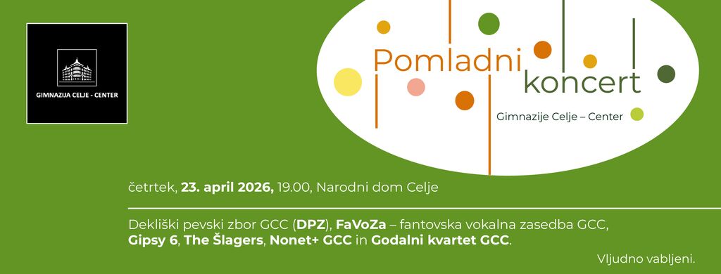 Vljudno vas vabimo na tradicionalni pomladni koncert Gimnazije Celje – Center, ki bo v četrtek, 23. aprila 2026, ob 19.00 v Narodnem domu Celje.