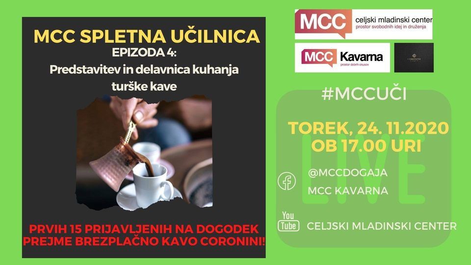 V torek, 24.11. vas v sodelovanju z MCC kavarno vabimo na četrto epizodo MCC spletne učilnice: predstavitev in delavnica kuhanja turške kave. Na delavnici boste izvedeli od kod kava prihaja, kakšni so okusi kave, kako poteka proces praženja kave in še, in še...