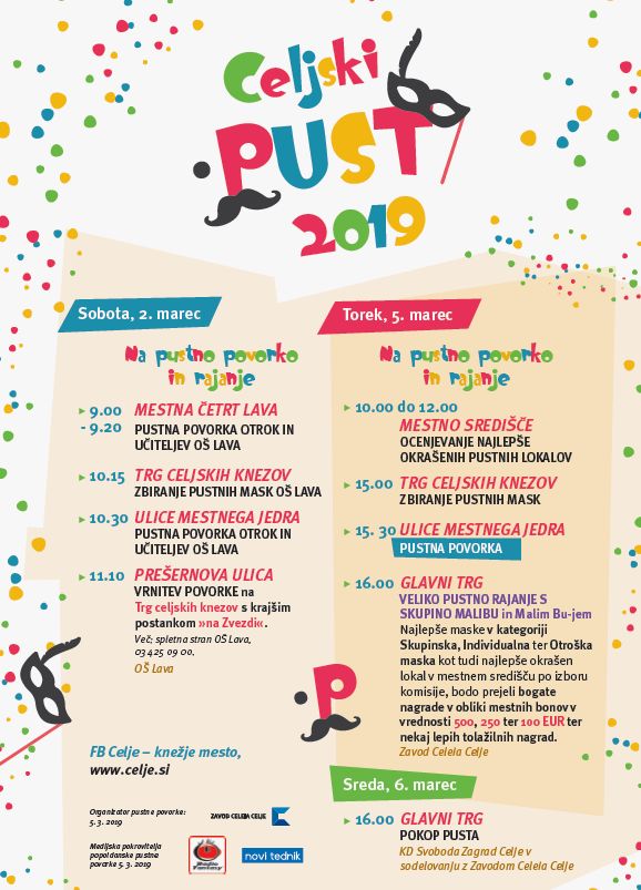 - v torek, 5.3. od 15.00 na Trgu celjskih knezov: zbiranje pustnih mask in pustna povorka v mestnem središču