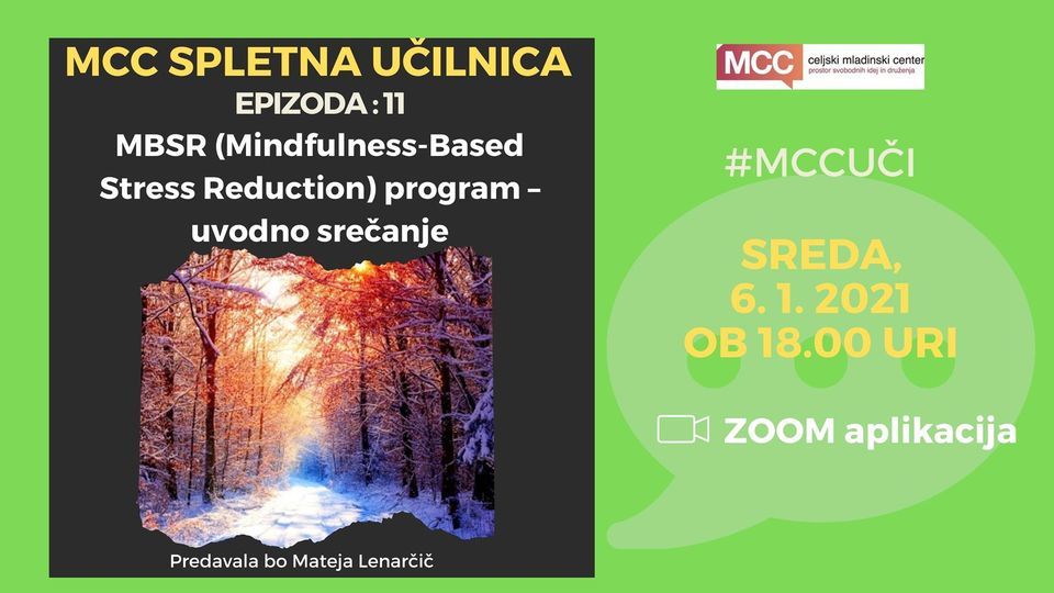 Vabljeni na brezplačno uvodno srečanje MBSR (Mindfulness-Based Stress Reduction) 8-tedenskega znanstveno raziskanega programa obvladovanja stresa na temelju čuječnosti, razvitega na Medicinski fakulteti Univerze Massachusetts, ZDA (dr. Jon Kabat-Zinn). Znanstvene raziskave zadnjih 40 let kažejo številne pozitivne učinke tega programa na področju človekovega psihofizičnega zdravja.