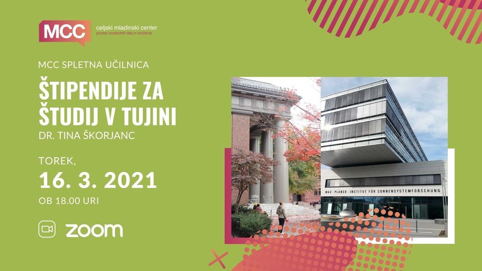 Predstavila bo možnosti na Japonskem, v Južni Koreji, Rusiji, Nemčiji, Singapurju, Kanadi, Italiji in Franciji ter v ZDA in Združenih arabskih emiratih, kjer je študirala tudi sama. Možnosti financiranja dodiplomskega študija v tujini obstajajo tudi v Sloveniji, zato bo opisala nekaj tovrstnih opcij.