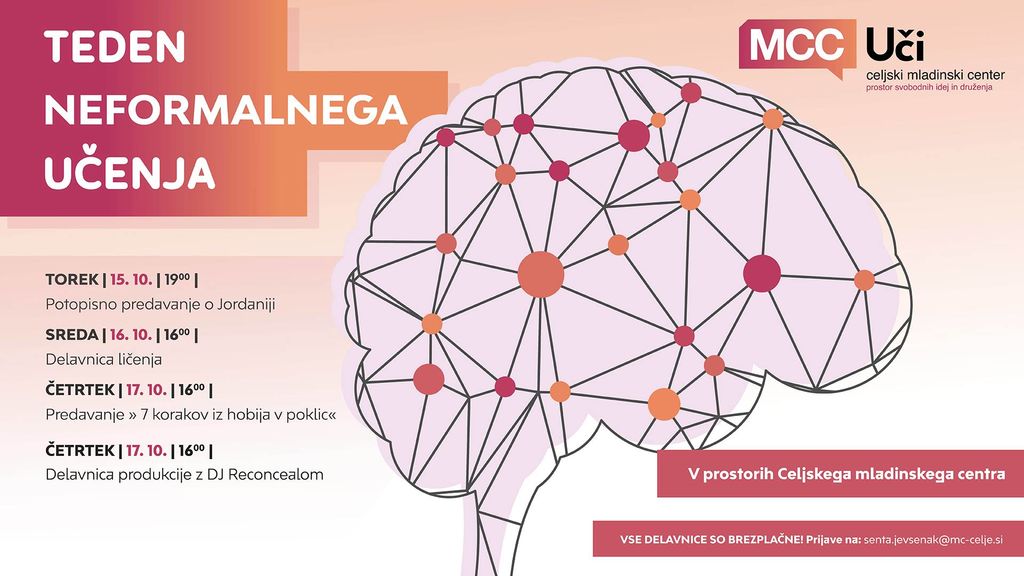 Celjski mladinski center vas vabi, med 15. in 17. oktobrom na Teden neformalnega učenja. V okviru projekta se bodo izvedle 4 delavnice, ki so namenjene mladim, ki jih zanimajo praktične vsebine neformalnega izobraževanja.