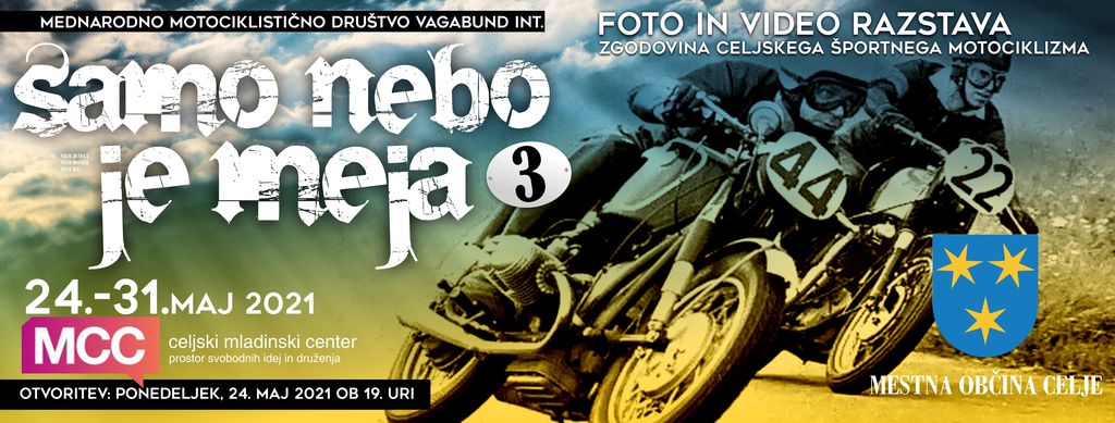 Mednarodno motociklistično društvo Vagabund v Celjskem mladinskem centru za vas pripravlja 3. del čudovite razstave fotografij ''Samo nebo je meja'', tokrat pa bo tematika razstave zgodovina celjskega športnega motociklizma.