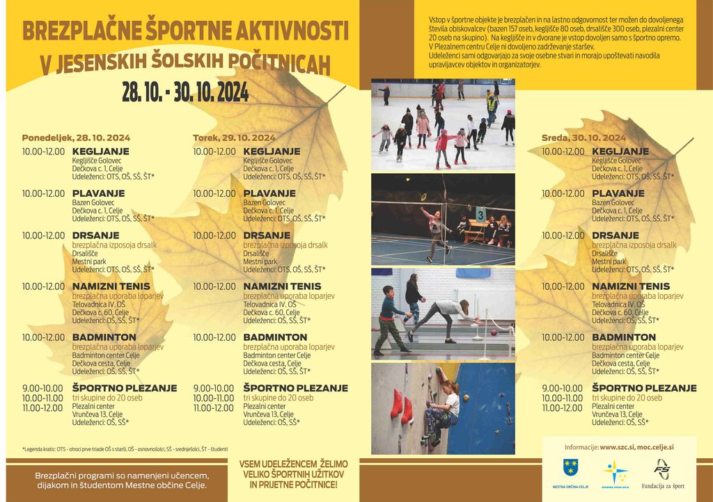 V športno-rekreacijskih objektih Mestne občine Celje bodo lahko osnovnošolci, dijaki in študenti od ponedeljka, 28. oktobra, do srede, 30. oktobra, izbirali med šestimi različnimi športi. Lahko bodo drsali, kegljali, plavali, igrali namizni tenis in badminton ter se preizkusili v športnem plezanju.