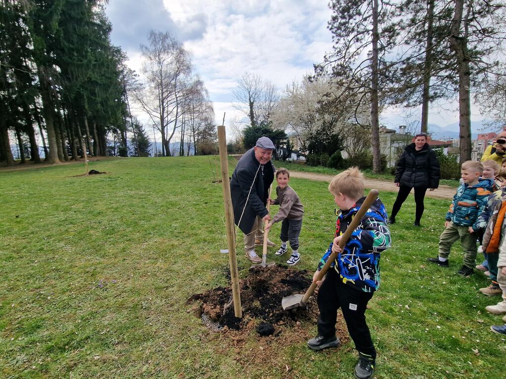 Celje, 23. marec 2026 – Mestna občina Celje sodeluje v projektu Čebelarske zveze Slovenije (ČZS) »Dan sajenja medovitih rastlin«, ki je bil minulo soboto, in ki povezuje v skupnem poslanstvu, ohranjati opraševalce ter soustvarjati bolj zeleno in cvetočo prihodnost. MOC je bila februarja uspešna na razpisu ČZS in je pridobila 30 sadik treh medovitih dreves. Posadili smo jih na različnih lokacijah po Celju, ob tem pa pripravili tri priložnostne svečane dogodke sajenja. Današnjega v enoti Vrtca Tončke Čečeve na Hudinji se je udeležil tudi župan Mestne občine Celje Matija Kovač, skupaj s podžupanom Samom Seničarjem.