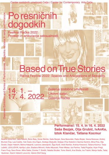 Večletni projekt Festival Račka, ki se usmerja na razmerje med seksualnostjo in umetnostjo, zaključujemo s pregledno razstavo izbora umetniških del, ki so nastala v slovenskem prostoru od devetdesetih let prejšnjega stoletja do danes, ter s serijo performansov, pripravljenih posebej za to edicijo festivala. Razstava Po resničnih dogodkih: prostori in artikulacije seksualnosti predstavlja različne vsebine in prostore seksualnega, ki so se izoblikovali v sodobnem slovenskem ustvarjalnem polju, ter različne načine umetniških pristopov. Razdeljena je v tri vsebinske sklope, in sicer telo, osvoboditev in intima, in je z mediji od slike, objekta, risbe, fotografije, videa in instalacije do performansa postavljena v Galeriji sodobne umetnosti, Likovnem salonu in Galeriji Račka.