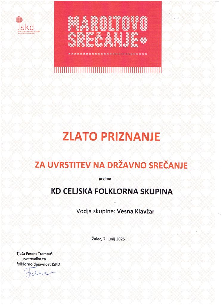 Uvrstitev na Maroltovo državno srečanje pomeni potrditev kakovosti plesnega in glasbenega dela folklorne skupine in omogoča vpogled in delo ostalih skupin. Vodilo KD Celjske folklorne skupine je kakovost in strokovnost. KD Celjska folkorna skupina je letos že tretjič zapored uspešno nastopila na Maroltovem državnem tekmovanju.