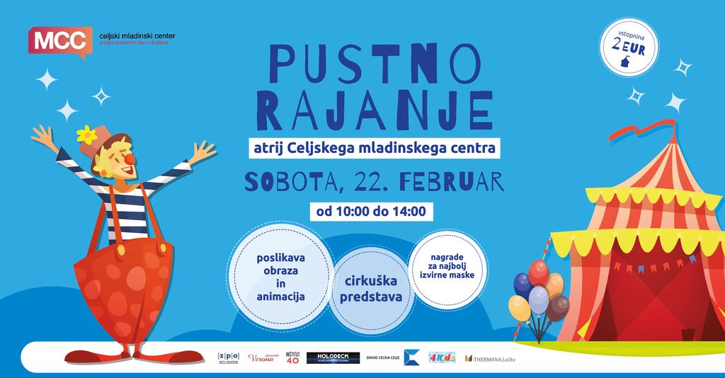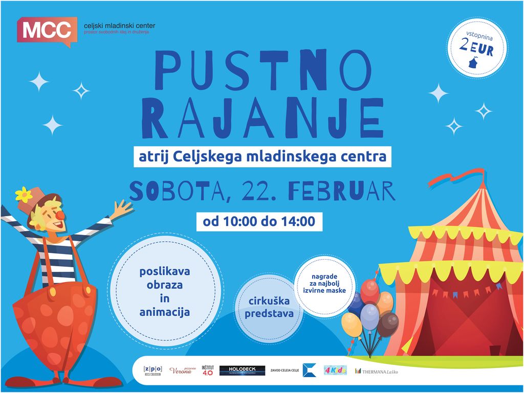 Mesec februar je v znamenju pustnega rajanja. Tudi letošnje leto Celjski mladinski center pripravlja tradicionalno Pustno rajanje za otroke, ki se bo odvijalo v soboto, 22.2.2020, s pričetkom ob 10.00 uri, v atriju Celjskega mladinskega centra.
