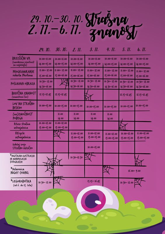 Delavnice Brezžični VR (navidezna resničnost za najmlajše), Programiranje robota Photona, Poslikava obraza, Buučna znanost (znanstveni šov), Lov na strašno besedo, (ne)ZMOŽNOST POBEGA (soba pobega), REuse strašna ustvarjalnica in REcycle ustvarjalnica bodo potekale v sklopu ogleda Tehnoparka Celje oziroma nakupa vstopnice.