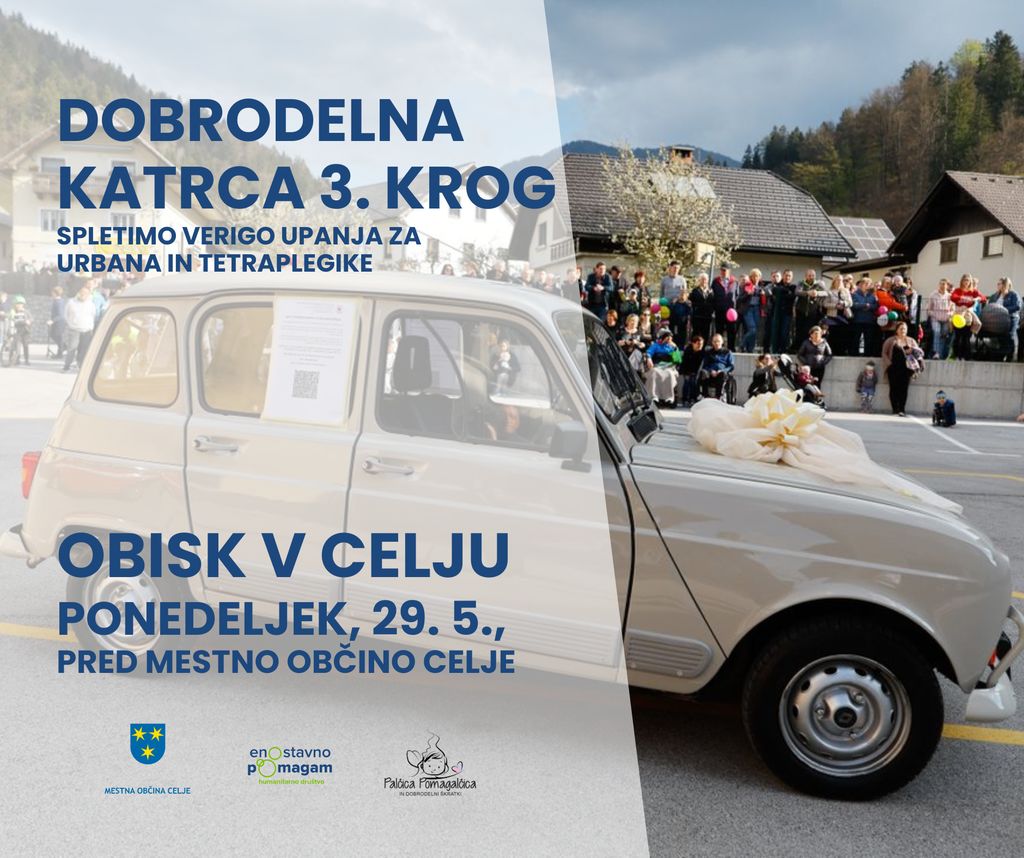 V ponedeljek, 29. maja 2023, nas bo v sklopu tretje dobrodelne akcije »Dobrodelna katrca 3. krog« v Celju obiskala znamenita katrca Boruta Pahorja. Tokrat plete verigo upanja za triletnega Urbana Miroševiča in Zvezo paraplegikov Slovenije za pripomočke tetraplegikov.