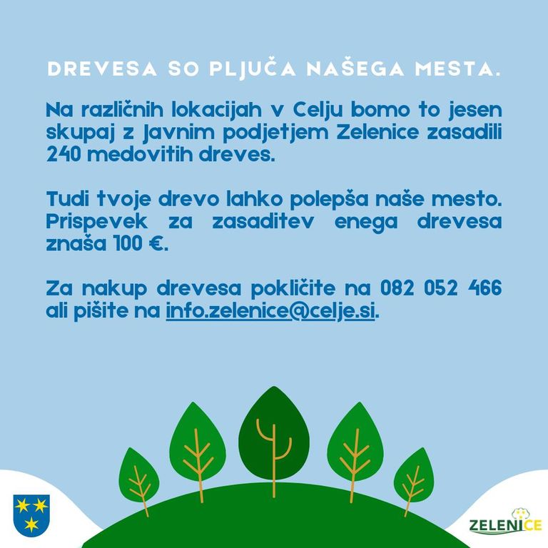 Občanke in občani, ki si želijo, da tudi njihovo drevo raste v Celju, naj pokličejo po telefonu 082 052 466 ali pišejo na info.zelenice@celje.si.