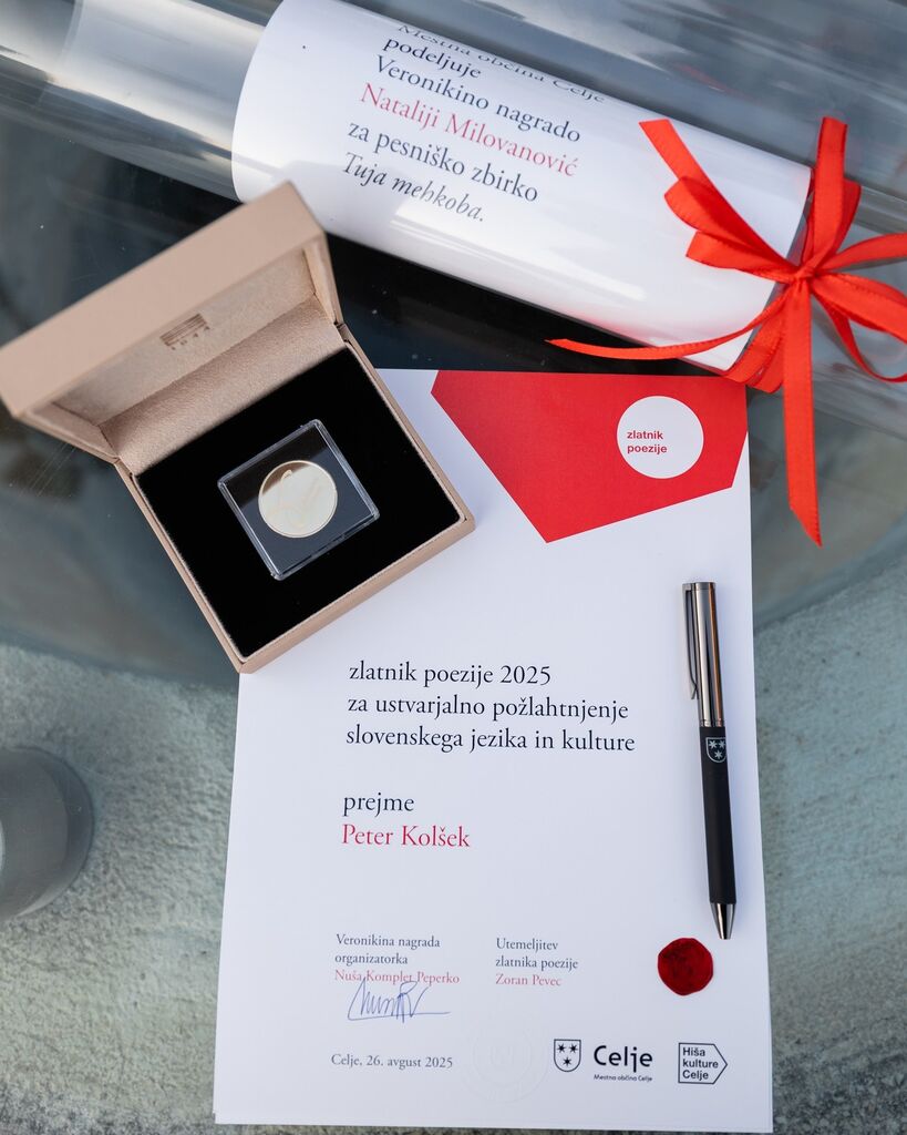 Na Veronikinem večeru poezije in glasbe smo na Celjskem gradu podelili Veronikino nagrado, zlatnik poezije in malo Veroniko. Po izboru strokovne komisije Veronikino nagrado 2025 za najboljšo pesniško zbirko leta prejme Natalija Milovanović za pesniško zbirko Tuja mehkoba.