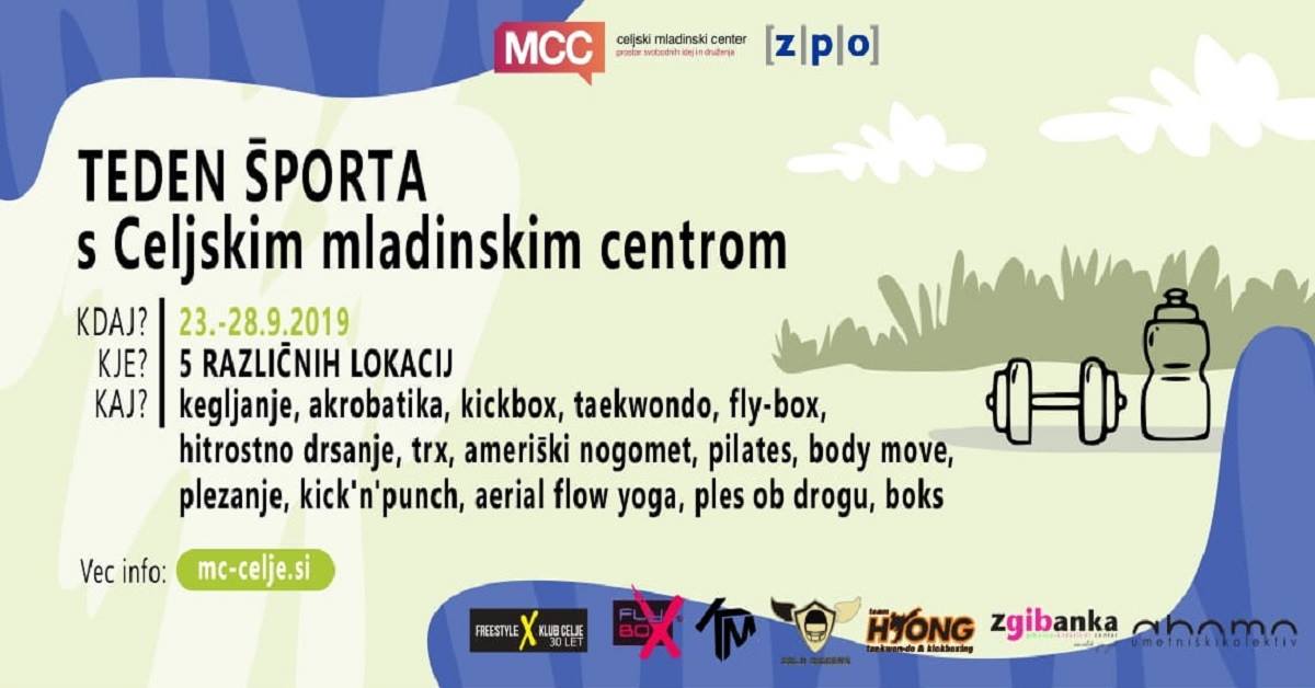Evropskemu tednu športa, ki ga po vsej Evropi obeležujemo med 23.9. in 30.9.2019 se je pridružil tudi Celjski mladinski center, saj podpira gibanje mladih in mladih po srcu. Spodbuja zdrav način življenja in v tednu športa želi spodbuditi tudi tiste skupine, ki so manj aktivne, da se priključijo najrazličnejšim oblikam gibanja in si najdejo zase prav tisto, ki jim je pisana na kožo. To pa je odlično izhodišče, da ljubljeno aktivnost vpeljejo v vsak dan in s tem okrepijo svoje zdravje in izboljšajo počutje.