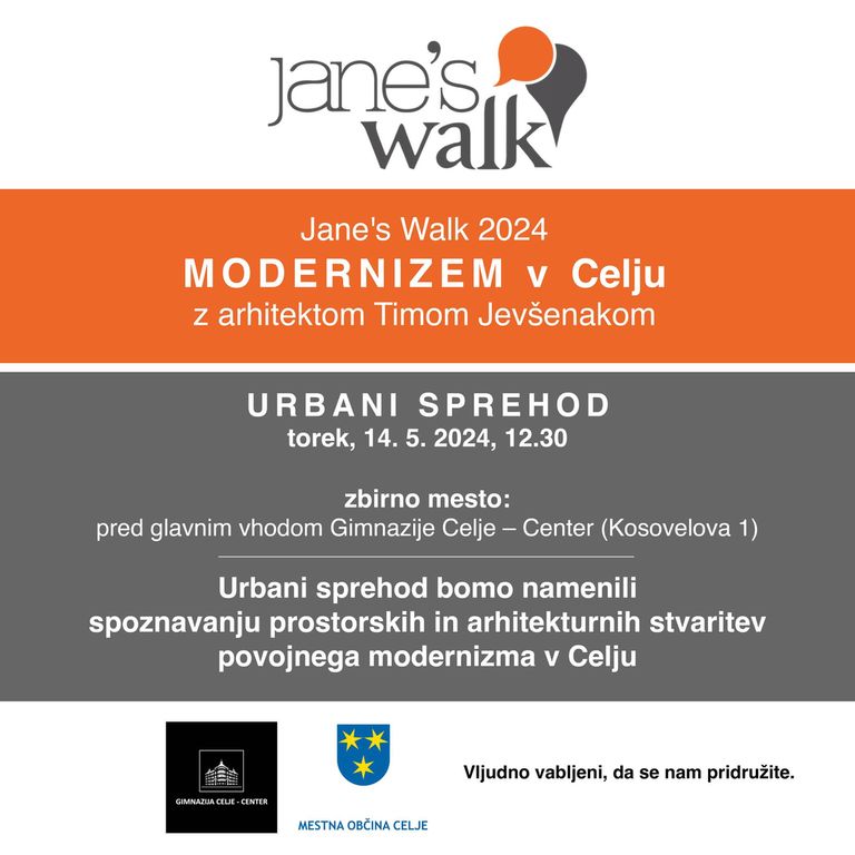 V Celju bomo tudi letos organizirali urbani sprehod Jane's Walk. 13. urbani sprehod po našem mestu bo vodil arhitekt Tim Jevšenak, namenjen pa bo spoznavanju in odkrivanju manj znanih prostorskih in arhitekturnih stvaritev povojnega modernizma, ko je Celje doživelo veliko industrijsko in urbanistično ekspanzijo.