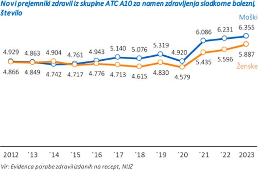 Število oseb z znano sladkorno boleznijo je v Sloveniji v letu 2023 ocenjeno na 149.160 oseb, kar je za 3.920 več kot v letu 2022 in za 7.318 več kot v letu 2021. Ocenjujemo, da se je v letu 2023 v Sloveniji zaradi sladkorne bolezni z zdravili zdravilo 126.786 oseb, kar je za 3.332 (2,6 %) več kot v letu 2022 in za 34.328 (37,1 %) več kot v letu 2010; med njimi je 69.143 (54,5 %) moških in 57.643 žensk (45,5 %). V 2023 je zdravila iz te skupine za zdravljenje sladkorne bolezni na novo začelo prejemati 12.242 oseb, kar je za 2.743 (3,5 %) več kot v 2020, med njimi je več moških kot žensk.