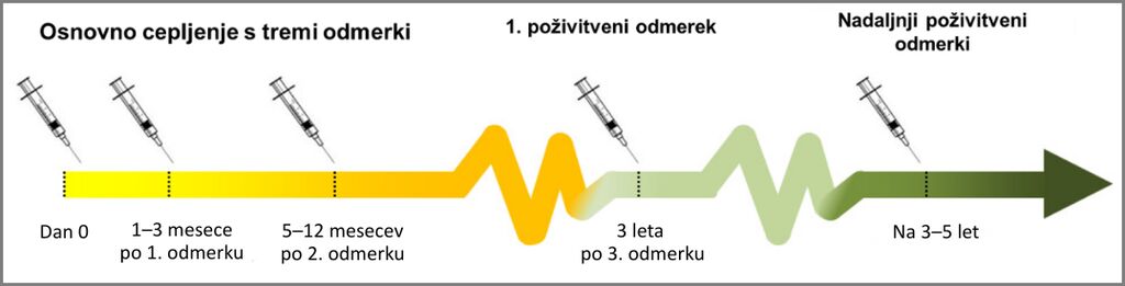 Za osnovno zaščito so potrebni trije odmerki cepiva. Drugi odmerek se običajno aplicira od enega do treh mesecev po prvem odmerku, če pa je potrebna hitra zaščita – na primer v času, ko so klopi že aktivni – se lahko drugi odmerek daje že po 14 dneh. Tretji odmerek sledi od pet do dvanajst mesecev po drugem odmerku. Za vzdrževanje zaščite po osnovnem cepljenju so potrebni poživitveni odmerki, prvi po treh letih, nato pa vsakih pet let. Pri osebah, starejših od 60 let, se poživitveni odmerki priporočajo na vsaka tri leta.
