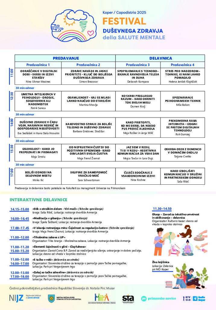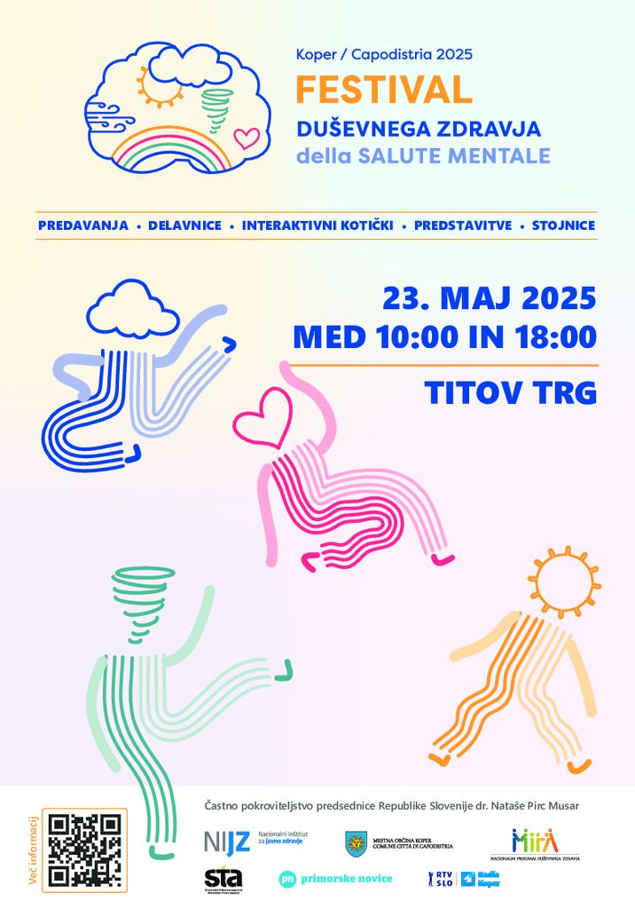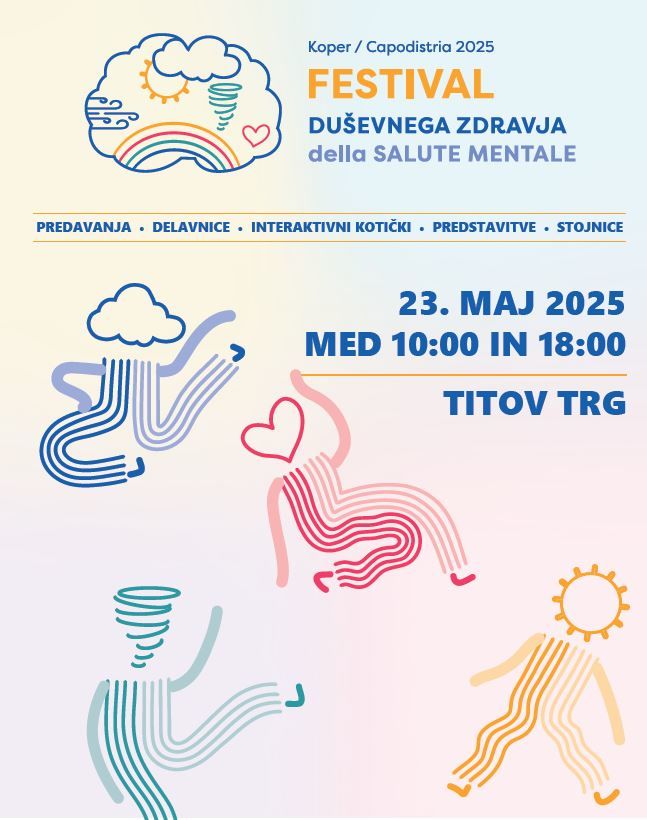 Festival duševnega zdravja, ki ga že tretje leto zapored organizira Nacionalni inštitut za javno zdravje v sodelovanju s partnerji, bo letos potekal 23. maja 2025 na Titovem trgu v Kopru. Festival je priložnost za raziskovanje različnih vidikov skrbi za duševno zdravje in preprečevanja duševnih stisk.