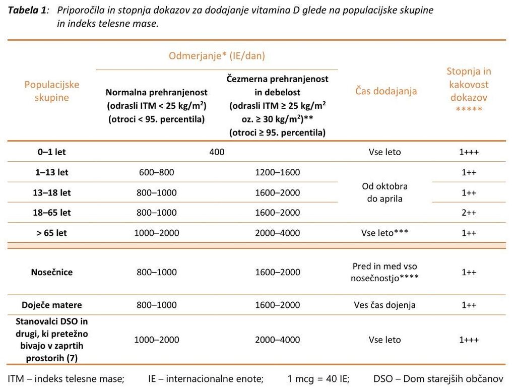 V novih slovenskih smernicah priporočamo dodajanje vitamina D v obliki zdravil ali prehranskih dopolnil izbranim ogroženim skupinam, ostalim zdravim prebivalcem Slovenije pa svetujemo jemanje vitamina D v razširjenem zimskem času.
