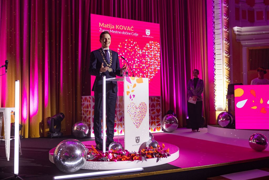 Po uvodni točki plesne skupine Force iz Plesne šole Plesni val Celje je polno dvorano Narodnega doma nagovoril župan, ki je povedal, da leto, ki se izteka, ob svojem zaključku prinaša veliko dosežkov in veselja. Matija Kovač, župan: »V teh decembrskih dneh sem od vseh občutij največkrat začutil občutek hvaležnosti in nekaj te si želim deliti tudi z vami. Hvaležen sem vsem, ki smo v to leto sprememb zakorakali povezani in usklajeni. Vsem, ki so znali postaviti cilje in prioritete za naše skupno delo. Hvala mestnim svetnikom in svetnicam, ki so ohranjali kulturo dialoga in znali kritično sodelovati pri udejanjanju programa in vizije, delovali složno in za dobrobit našega mesta.