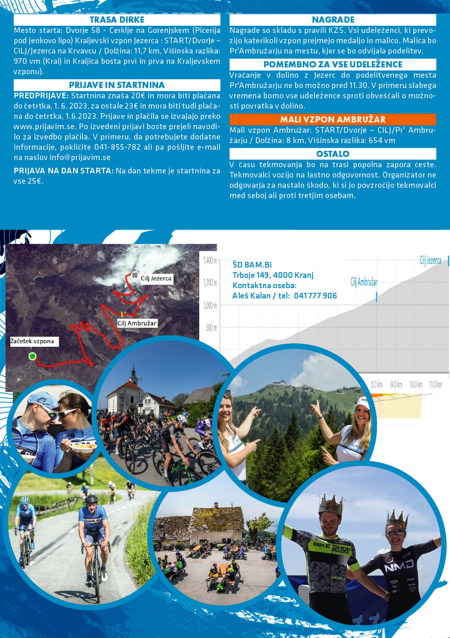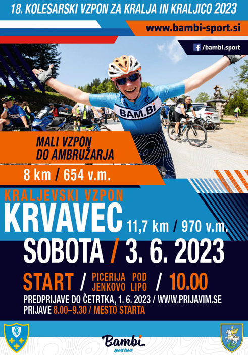 Športno društvo BAM.Bi vas obvešča, da bo v soboto, 3. junija 2023, s startom ob 10h, na sporedu tradicionalni, že 18. kolesarski vzpon na Krvavec.