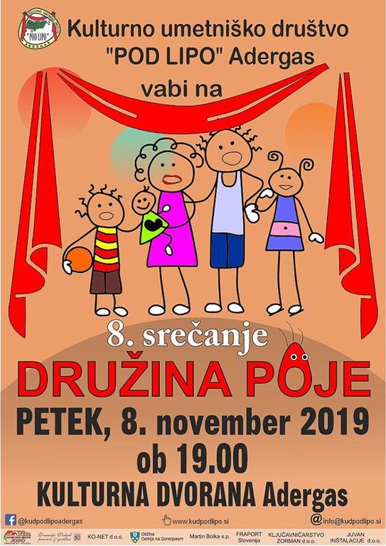V petek, 8. novembra 2019, vas Kulturno društvo Pod lipo Adergas ob 19. uri vabi v Kulturno dvorano v Adergasu na tradicionalno srečanje Družina poje. Prisluhnili boste družinam, ki gojijo ljubezen do slovenske pesmi.