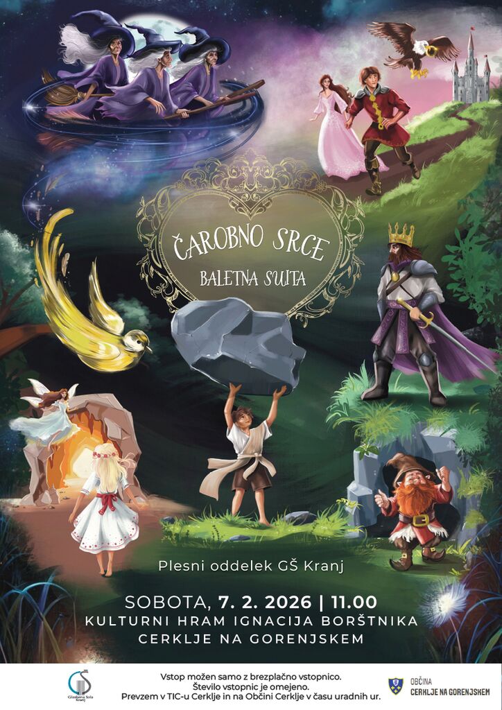 Občina Cerklje na Gorenjskem vas vljudno vabi na baletno suito Čarobno srce, ki jo ob slovenskem kulturnem prazniku pripravlja plesni oddelek Glasbene šole Kranj. Dogodek bo potekal v soboto, 7. februarja 2026, ob 11. uri v Kulturnem hramu Ignacija Borštnika v Cerkljah.