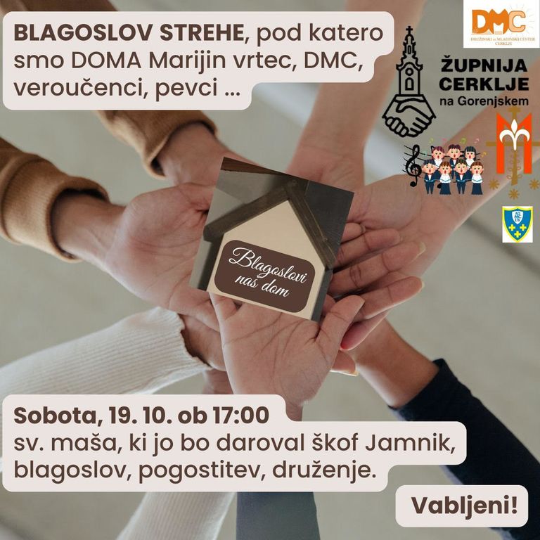 Župnija Cerklje na Gorenjskem vabi na blagoslov prenovljene strehe Marijinega vrtca, ki bo v soboto, 19. oktobra, ob 17. uri na župnijskem dvorišču.