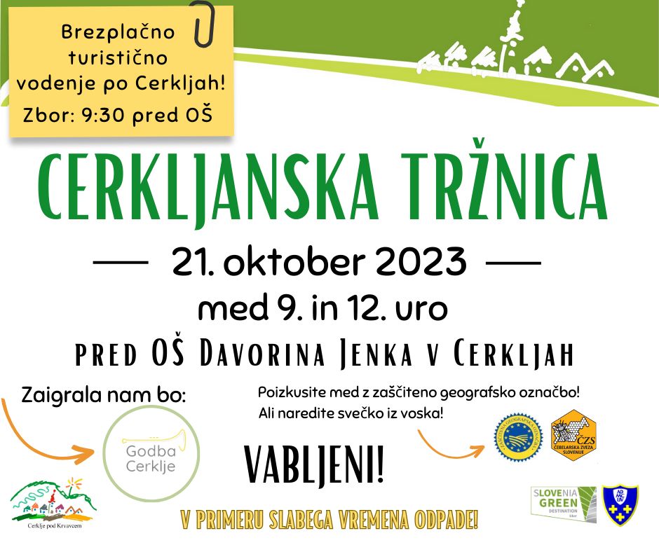 Z veseljem vas ponovno vabimo na Cerkljansko tržnico, ki bo potekala 21. oktobra pred OŠ Davorina Jenka v Cerkljah, med 9. in 12. uro.