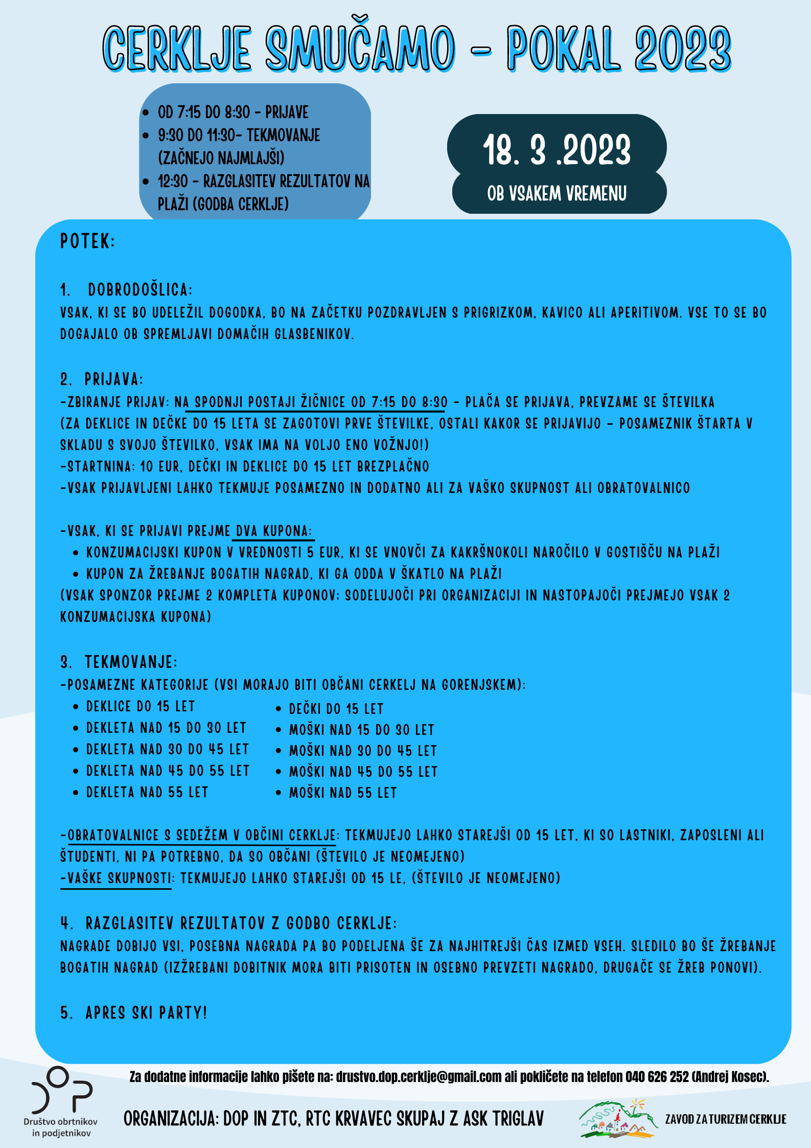 Društvo DOP in ZTC vabita na prireditev Cerklje smučamo - pokal 2023, ki bo 18. 3. 2023 na KRVAVCU.