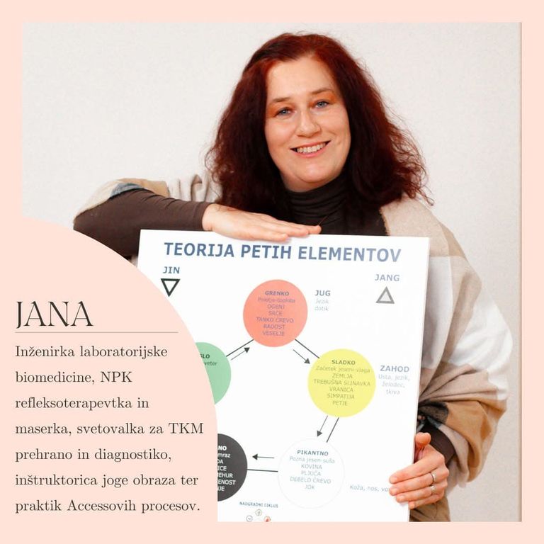 Jana – Inženirka laboratorijske biomedicine, NPK refleksoterapevtka in maserka, svetovalka za TKM prehrano in diagnostiko, inštruktorica joge obraza ter praktik Accessovih procesov (Access Bars, MTVSS, Energijski Facelift).