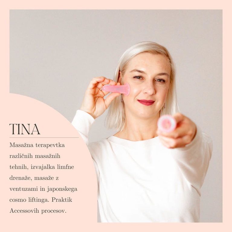 Tina – Masažna terapevtka različnih masažnih tehnik na telesu in obrazu, izvajalka limfne drenaže in masaže z ventuzami, Access Bars in MTVSS praktik, izvajalka japonskega cosmo liftinga po Sorensensistem in izvajalka apliciranja kolagenskih niti.