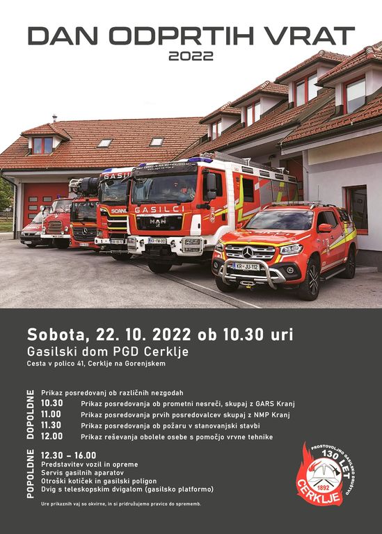 V letu, ko PGD Cerklje na Gorenjskem praznuje 130. letnico delovanja, vas vabimo na dan odprtih vrat, ki bo v soboto 22. oktobra 2022 od 10.30 ure dalje.