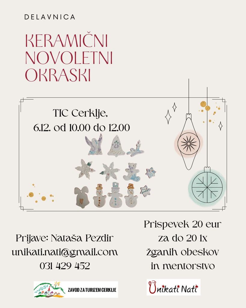 Prisrčno vas vabimo na ustvarjalno delavnico, kjer bomo izdelovali keramične novoletne okraske – unikatne, ročno oblikovane dekoracije, ki bodo vašemu domu ali božičnemu drevesu dodale prav poseben osebni pečat.