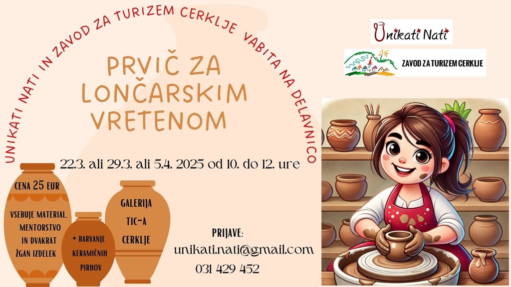 Ste si kdaj želeli oblikovati svojo skodelico, vazo ali krožnik? Zdaj je pravi čas! Pridružite se naši lončarski delavnici za začetnike, kjer boste doživeli vrtiljak občutkov ob oblikovanju gline na vretenu. Poleg enega izdelka z vretena boste lahko poslikali že oblikovane keramične pirhe, ki jih boste glazirane in odžgane kasneje odnesli domov.