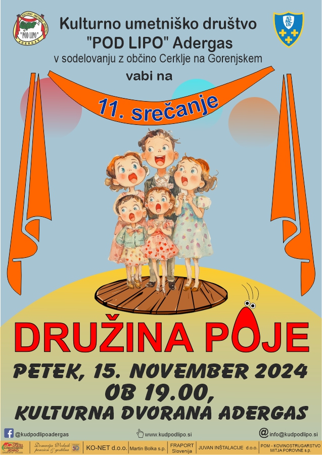 V petek 15. 11. 2024, pred Martinovo soboto, bodo tradicionalno pele družine v Adergasu. Kar deset družin bo zapelo po eno narodnozabavno in eno ljudsko pesem. Lepo vas vabimo na domače, družinsko petje v kulturno dvorano v Adergas.