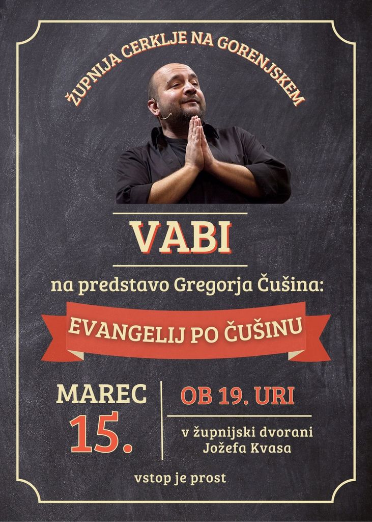 Župnija Cerklje vas vabi na izjemno gledališko predstavo Evangelij po Čušinu, ki bo v soboto, 15. marca 2025, ob 19.45 v župnijski dvorani Jožefa Kvasa.